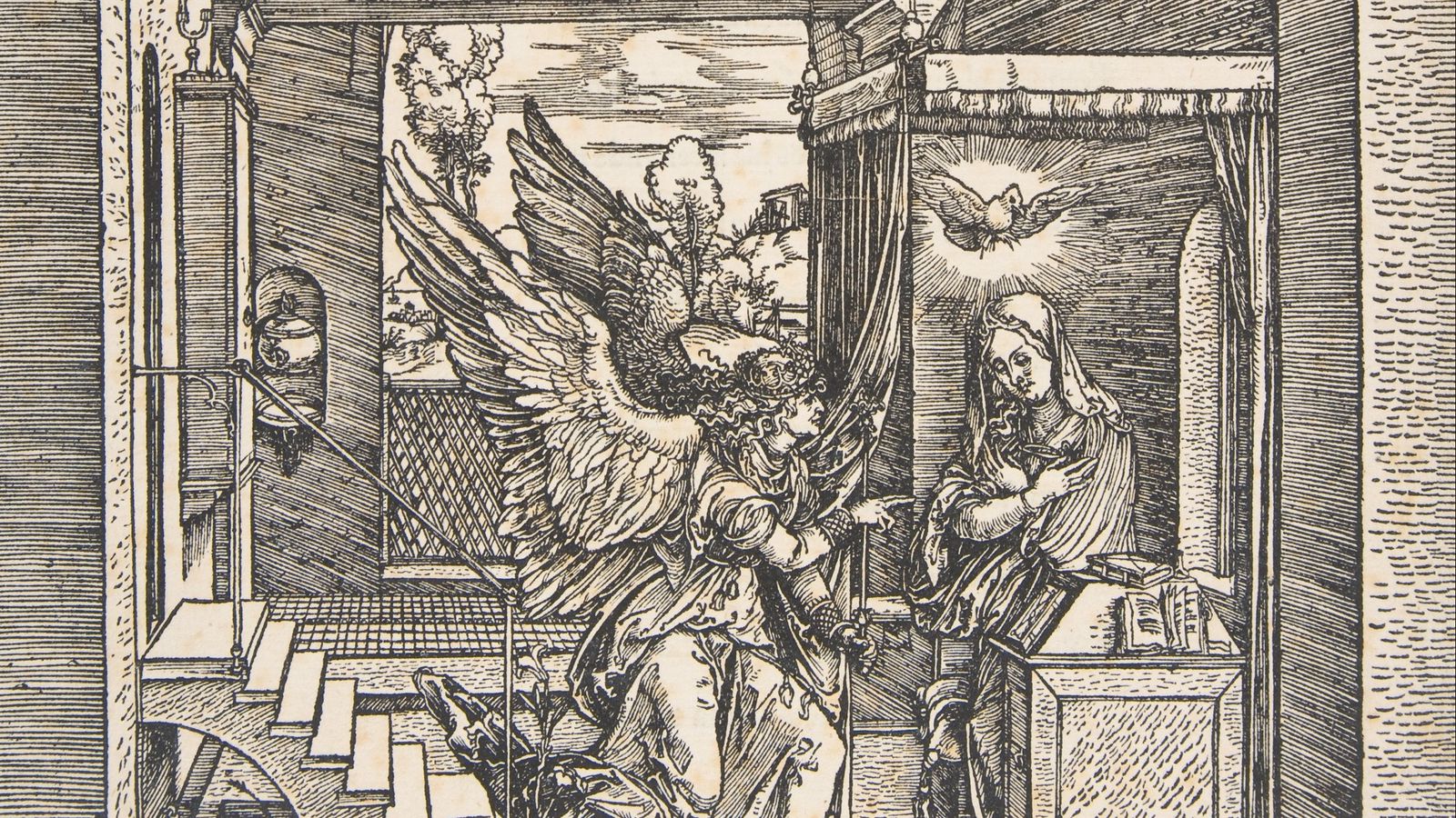 Download 1600x900 albrecht durer, the annunciation, from the life of the virgin, virgin mary, angels, archangels, engraving wallpaper, background widescreen 16:9