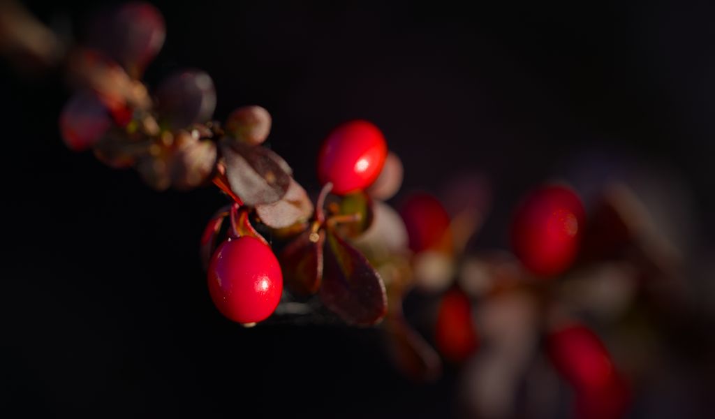 Download 1024x600 barberry, berries, leaves, branches, macro, dark wallpaper, background netbook, tablet