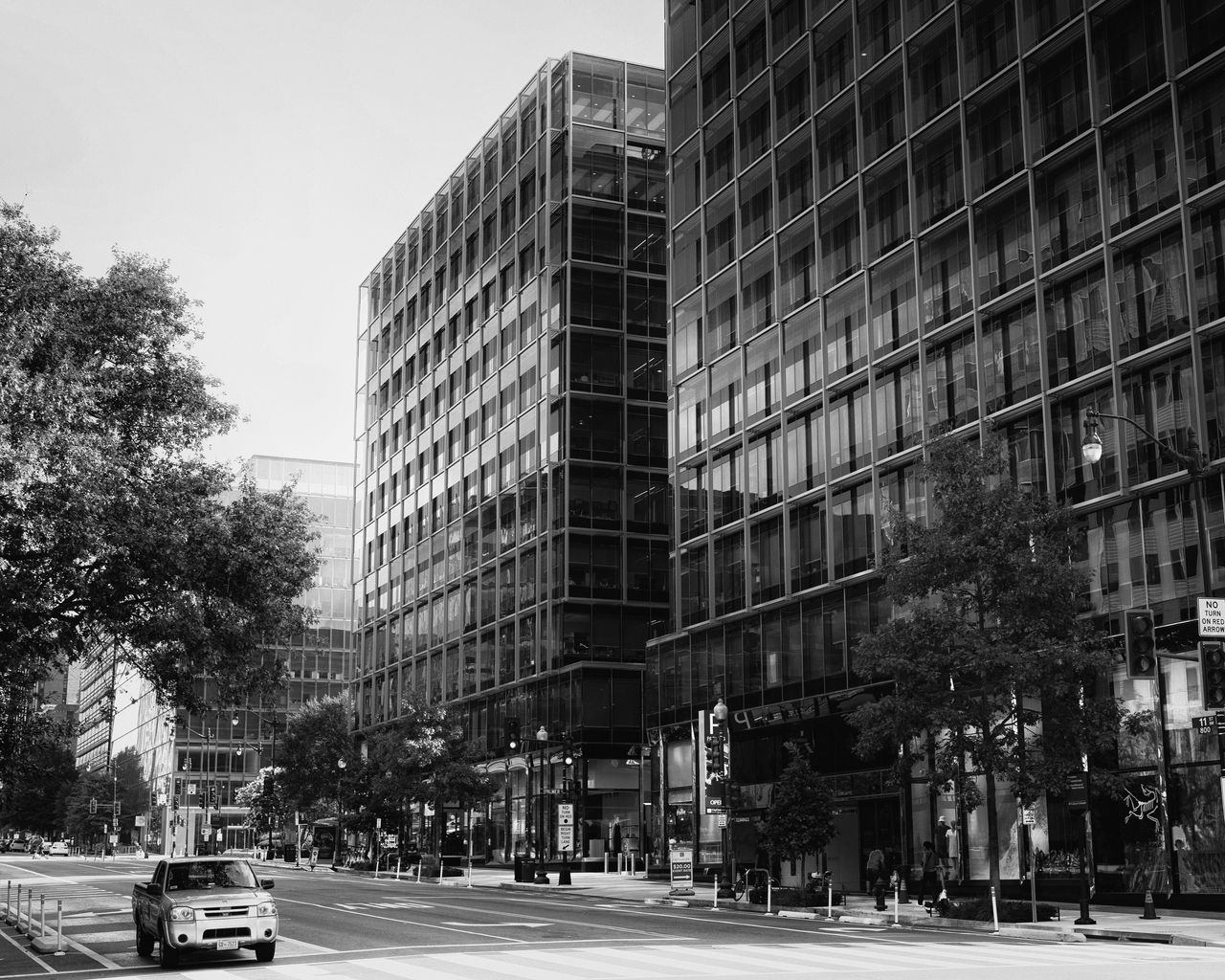 Download 1280x1024 buildings, city, car, trees, street, bw wallpaper, background standard 5:4