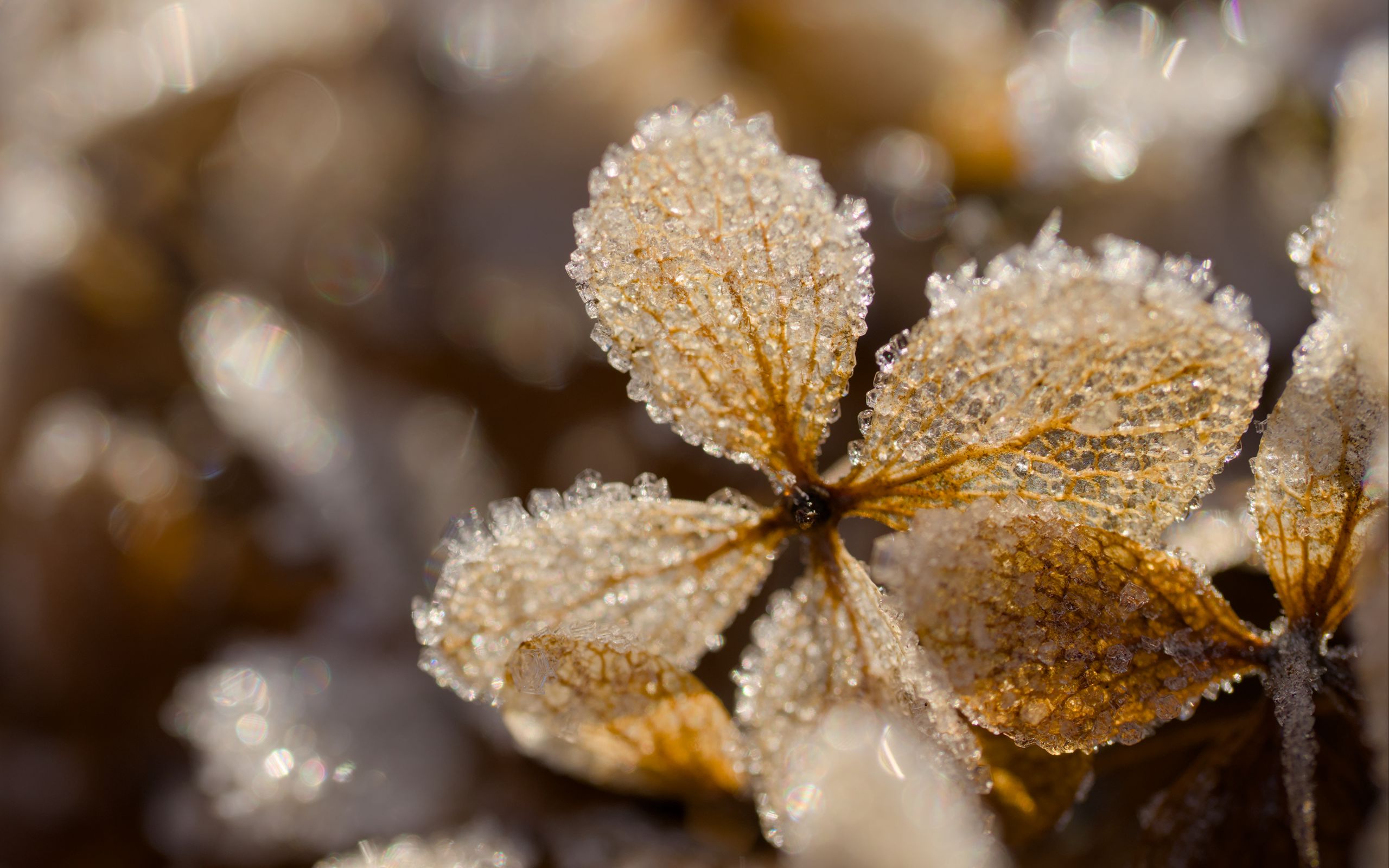 Download 2560x1600 leaves, ice, frost, glare, macro wallpaper, background widescreen 16:10
