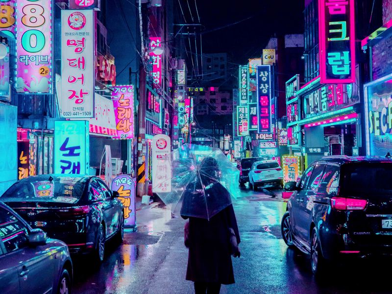 Download 800x600 night city, street, umbrella, man, signboards, lighting, neon wallpaper, background pocket pc, pda