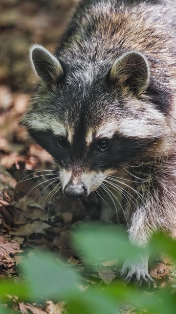 Download 360x640 raccoon, animal, wildlife, leaves, autumn wallpaper, background nokia n8, c5, c6, c7, e7, x6 nokia 5800, 5230, 5228, sony ericsson vivaz