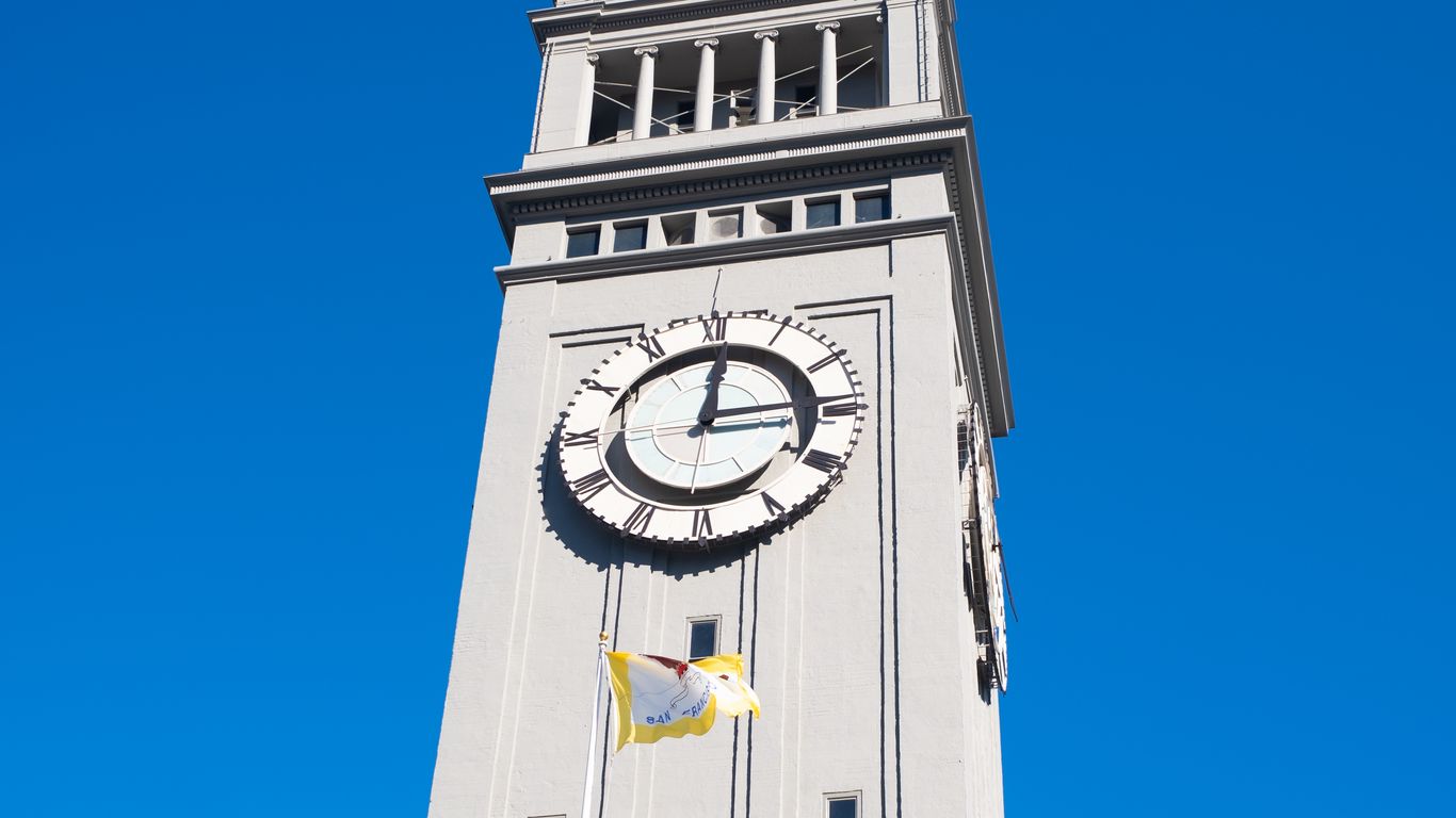 Download 1366x768 tower, clock, building, architecture, flag, city, san francisco wallpaper, background tablet, laptop